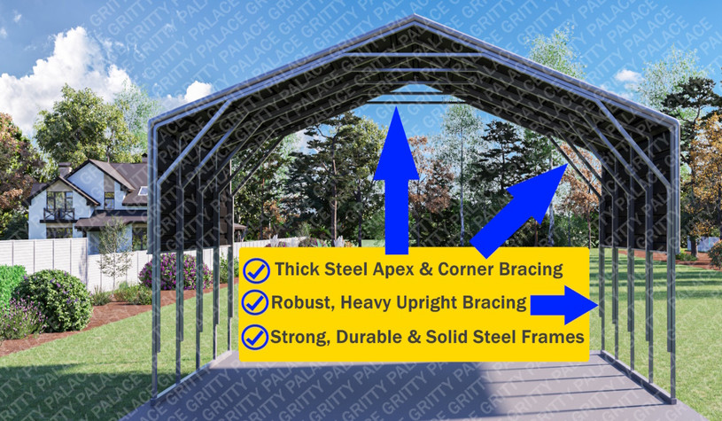 - Solid Steel Posts With Added Steel Uprights, Steel Corner & Steel Apex Bracing.