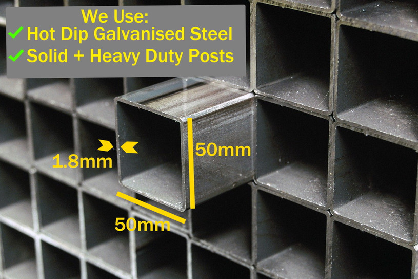 • All shade shed posts are extremely solid, featuring 50mm x 50mm sizes which are 1.8mm thick, further reinforced and protected by Hot-Dip Galvanization.