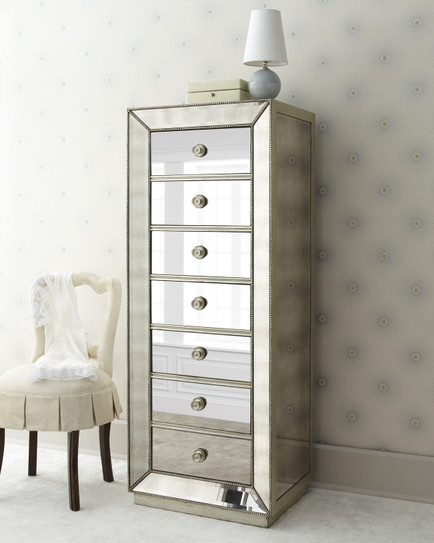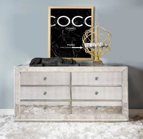 Featuring beautiful, subtle silver beaded trimming and paired with crystal style handles allows for an opulent contrast with the mirrors on the bedside table, dressing table and tallboy.